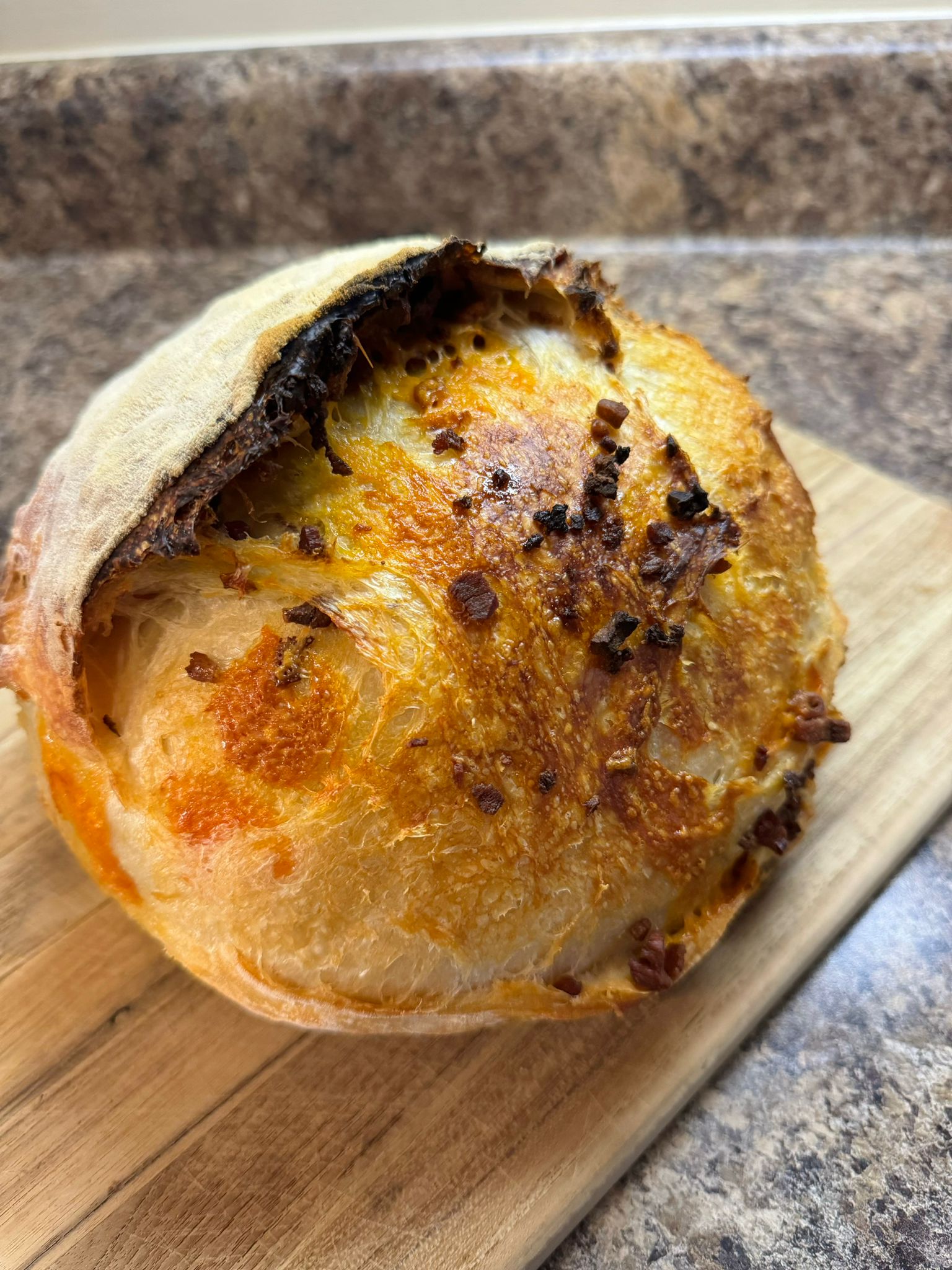 Cheddar sourdough bread is a rich, savory loaf with a crisp crust and a tangy, cheesy flavor. Melted cheddar weaves through the soft crumb, adding a bold, comforting taste to every bite.