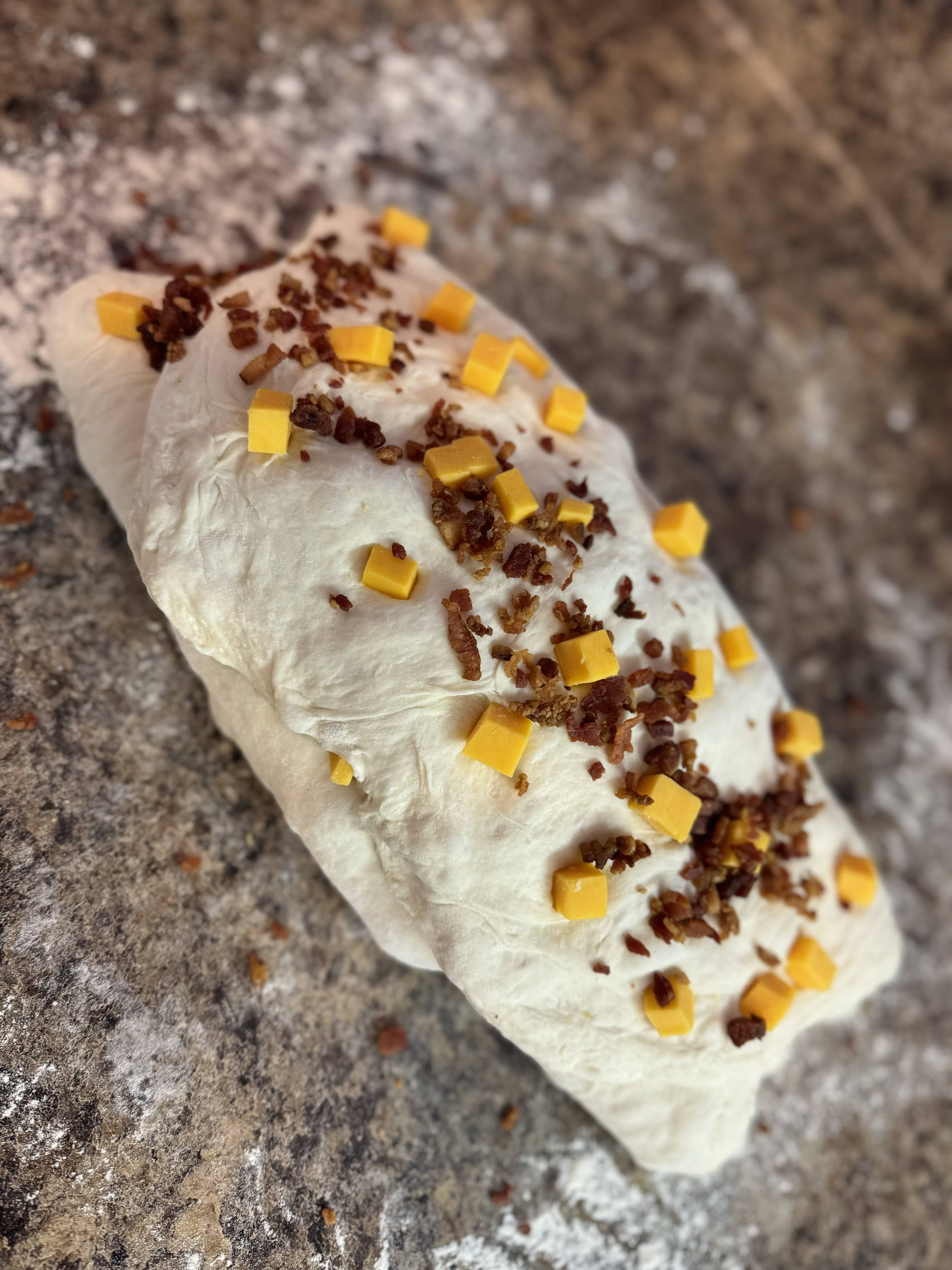 Bacon cheddar sourdough loaf is a savory, flavorful bread filled with smoky bacon and melted cheddar. Its crisp crust and tangy crumb make it a rich, comforting loaf perfect for any meal.